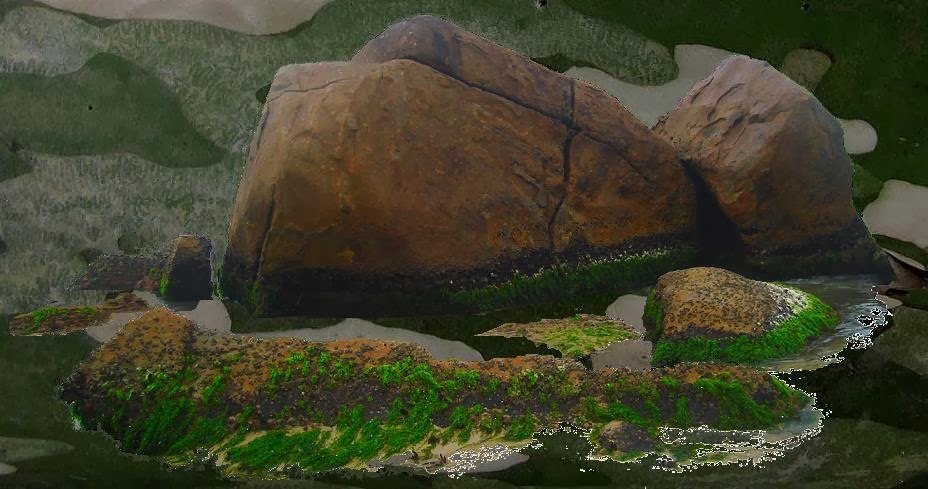 Cobertas de musgo mal percebe-se sua presença, corroídas pelo sol causticante ficam esbranquiçadas e esgueiras, ou então, vívidas em cores berrantes amaciadas pela água.