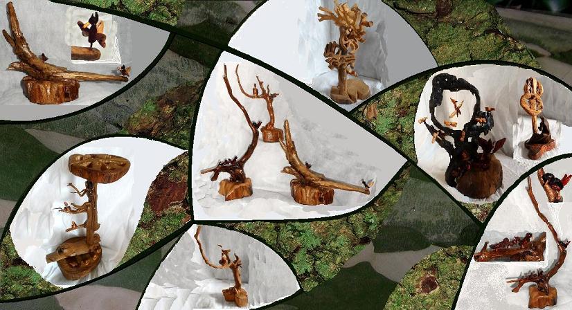 Troncos esculpidos pela natureza aportados sobre bases e com micro-escultura de pássaros, peças de centímetros de tamanho e com detalhes milimétricos.