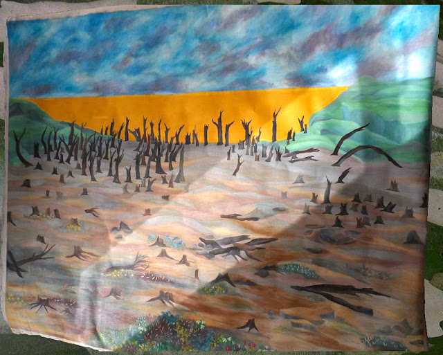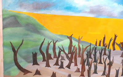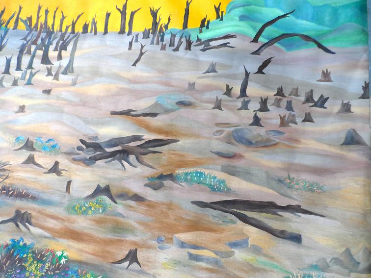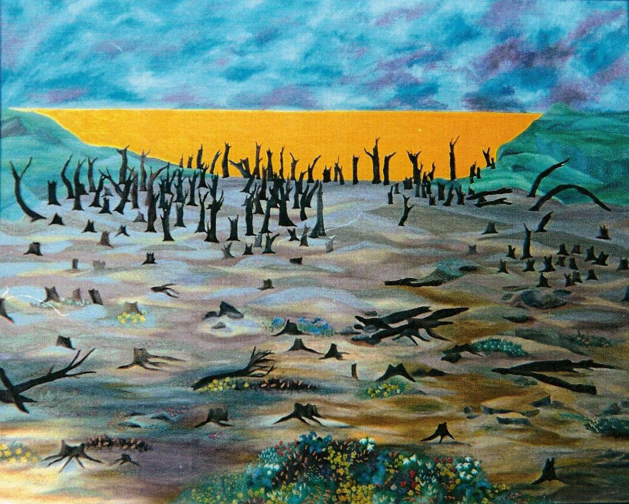 Troncos de árvores mortos e retorcidos dançam em um solo fluído, lamoso, ondulando e distorcendo as figuras, o horizonte amarelo mostra-se impactante e espetacularmente presente, tentando invadir todo o horizonte, quase no limite das montanhas verdes que o prendem. Não trata-se de um por do sol brilhante e sim de uma tênua ligação entre vida e morte.