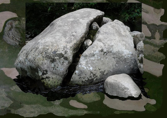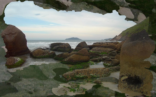Nada mais inovador que encontrar na natureza a obra de arte pronta, finalizada e adaptada ao ambiente. Quando avistei primeira vez a obra abaixo, não pude parar de admirar a simplicidade desta complexa obra, uma pedra partida ao meio, amolada pelas águas e intensamente colorida de fungos esbranquiçados. Em meio a sua divisão outras pedras param abraçadas pelo abrigo seguro da fenda.