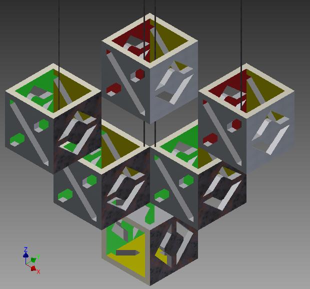 Os cubos vazados simbolizam escolhas, externamente com superfícies metálicas, nossos maiores consumos e por dentro iluminadas com cores fluorescentes como verde, amarelo, vermelho e negro (sem luz). Tentam impactar a dinâmica do consumo, todos precisam de um carro, uma casa, um celular e assim por diante.